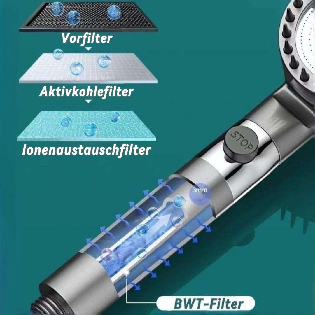 Der Duschkopf enthält austauschbare Wasserfilter, die das Wasser sauberer, weicher und gesünder machen.
